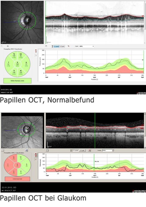 Als wertvolle Zusatzdiagnostik steht uns sowohl für die Erstdiagnose als auch für die Verlaufskontrolle unter anderem das OCT des Sehnerven (optische Kohärenztomografie) zur Verfügung. Mit OCT-Kontrollen kann man messen, ob bereits ein Verlust an Nervenfasern vorliegt und ob der Sehnerv über die Jahre stabil bleibt oder nicht und ob ggf. die Therapie geändert werden muss.